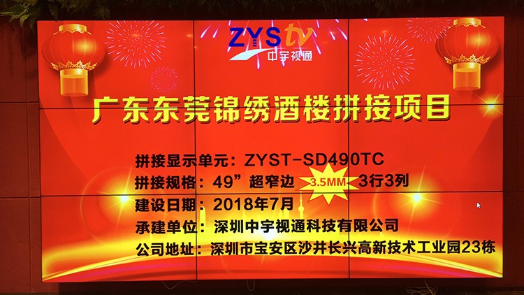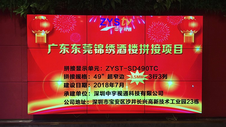 廣東東莞市錦繡酒樓選用深圳中宇視通科技49寸3.5拼縫拼接屏項(xiàng)目安裝調(diào)試完成且順利通過(guò)驗(yàn)收。
