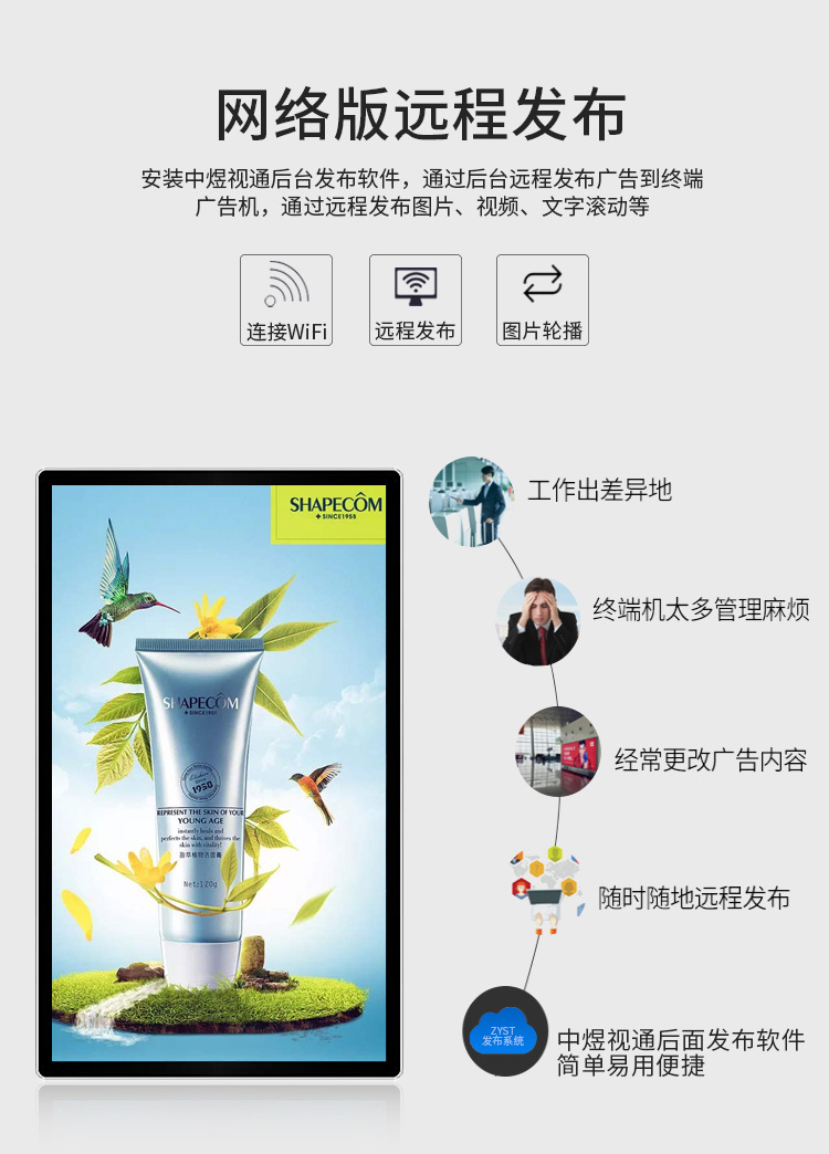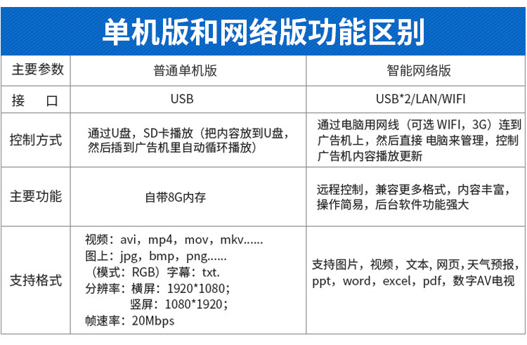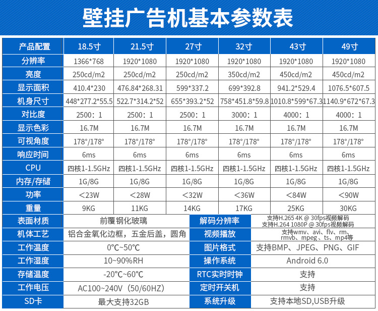 21.5寸壁掛廣告機采用專業級工業液晶屏,視頻圖像展現清晰、自然,能夠更好的表現廣告細節;機身設計外觀時尚、大方,超薄,使用方便、美觀,采用全新環保技術,穩定性好,能夠適應并在惡劣環境中正常工作。正常使用情況下,可達60000小時以上的超長的使用壽命,并且能夠7*24小時不間斷工作。目前,液晶廣告機憑借優良的顯示性能,已經成為人們認同的理想的“第五大媒體”顯示設備。