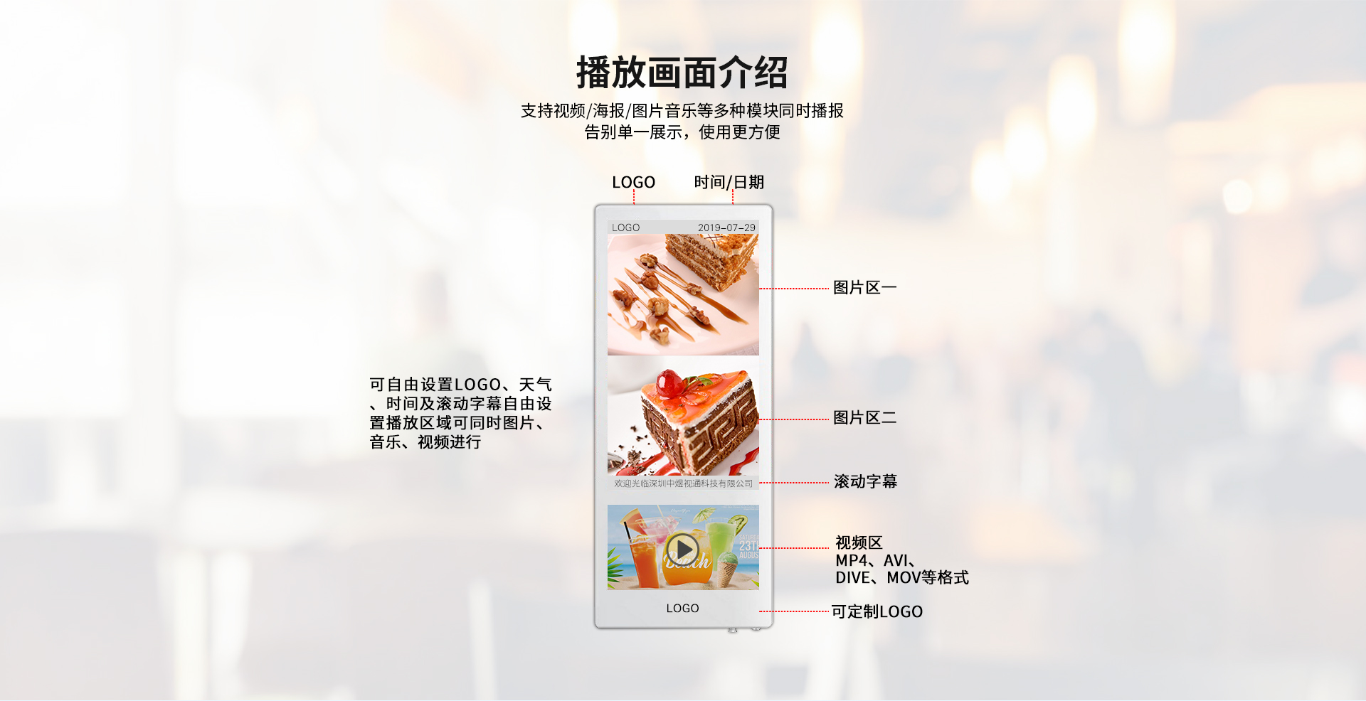 支持多種分屏模式:分屏模式,流暢轉碼,滿足多任務需求,系統自帶分屏功能,內置三種分屏模式,視音頻轉碼流暢播放,兼容多種文件格式。多種鏈接接口,滿足不同的接入要求:機器自帶USB接口、SD卡槽、遙控頭接口、4G卡槽、以太網口遠程節目發布管理:中煜視通分眾傳媒電梯廣告機采用B/S架構,嵌入式安卓5.1以上操作系統,只需安裝發布系統登錄控制后臺,即可對終端進行操作管理。