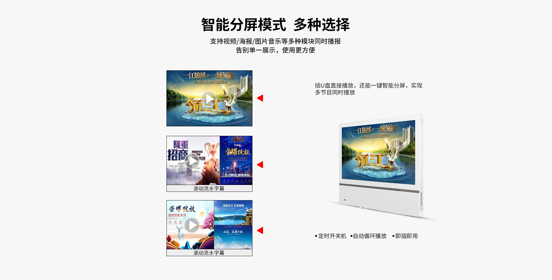 U盤即插即播:插入U盤或者SD卡,痛電就能識別文件,自動循環播放,支持多種文件格式,網絡版在斷網狀態下支持U盤播放。